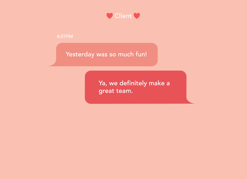 While the nature of this professional relationship is quite different from that of a budding romance, you find yourself in many of the same conversations, and experiencing familiar insecurities, desperation, and excitement. As experts in the subject-matter of courtship (we've all had our fair share of dates, whether they be of the Tinder or Save-The- variety), we reimagined some of those classic texts you get from that 'special someone' - the first date follow-up, the late night call, and the dreaded ghost - as told by the client-agency *romance*.